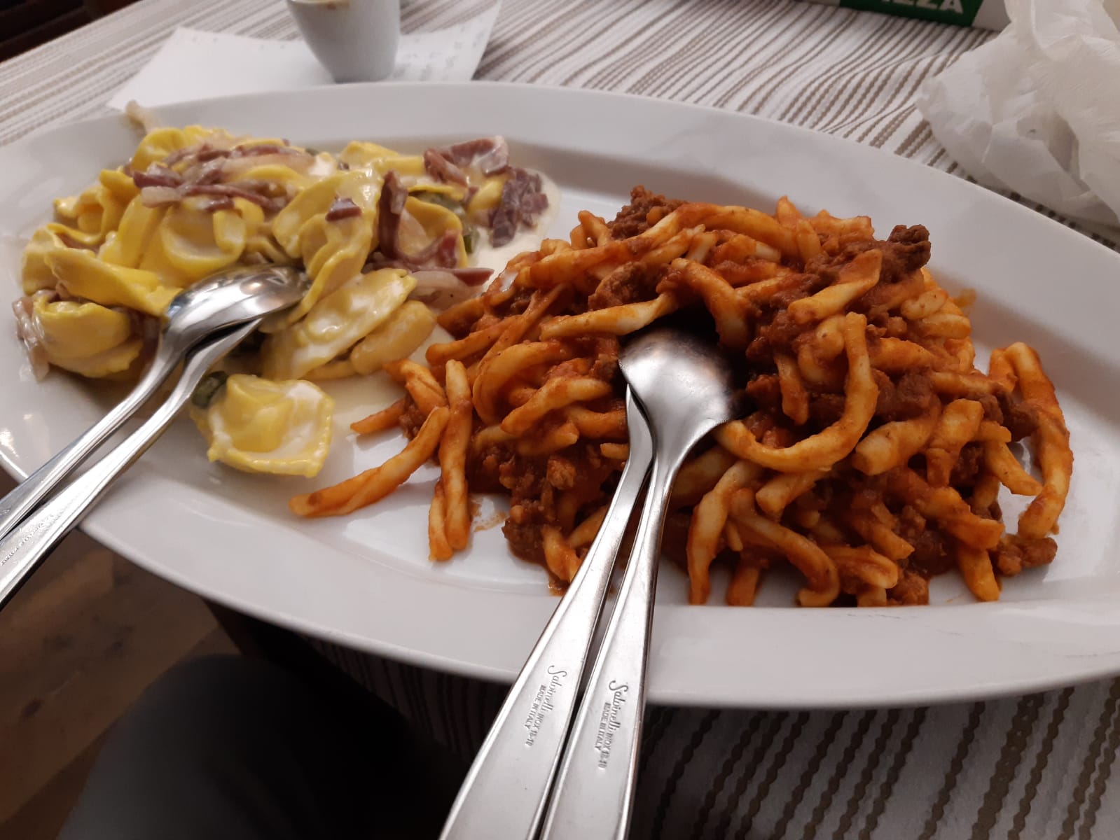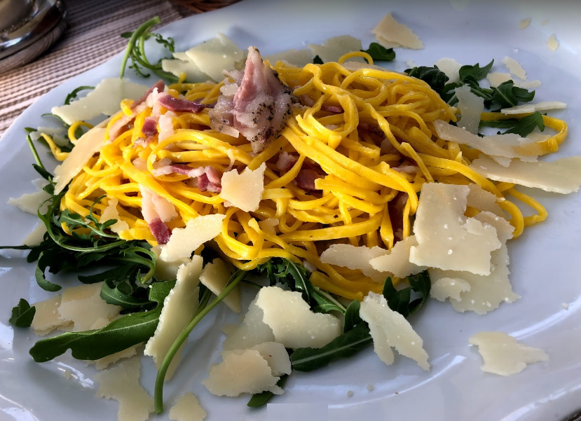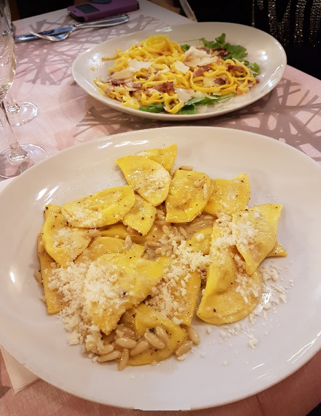 tagliolini mezzanotte (guanciale, rucola e scaglie di grana), ravioli noci e mascarpone, lasagne al forno, gnocchi al gorgonzola,