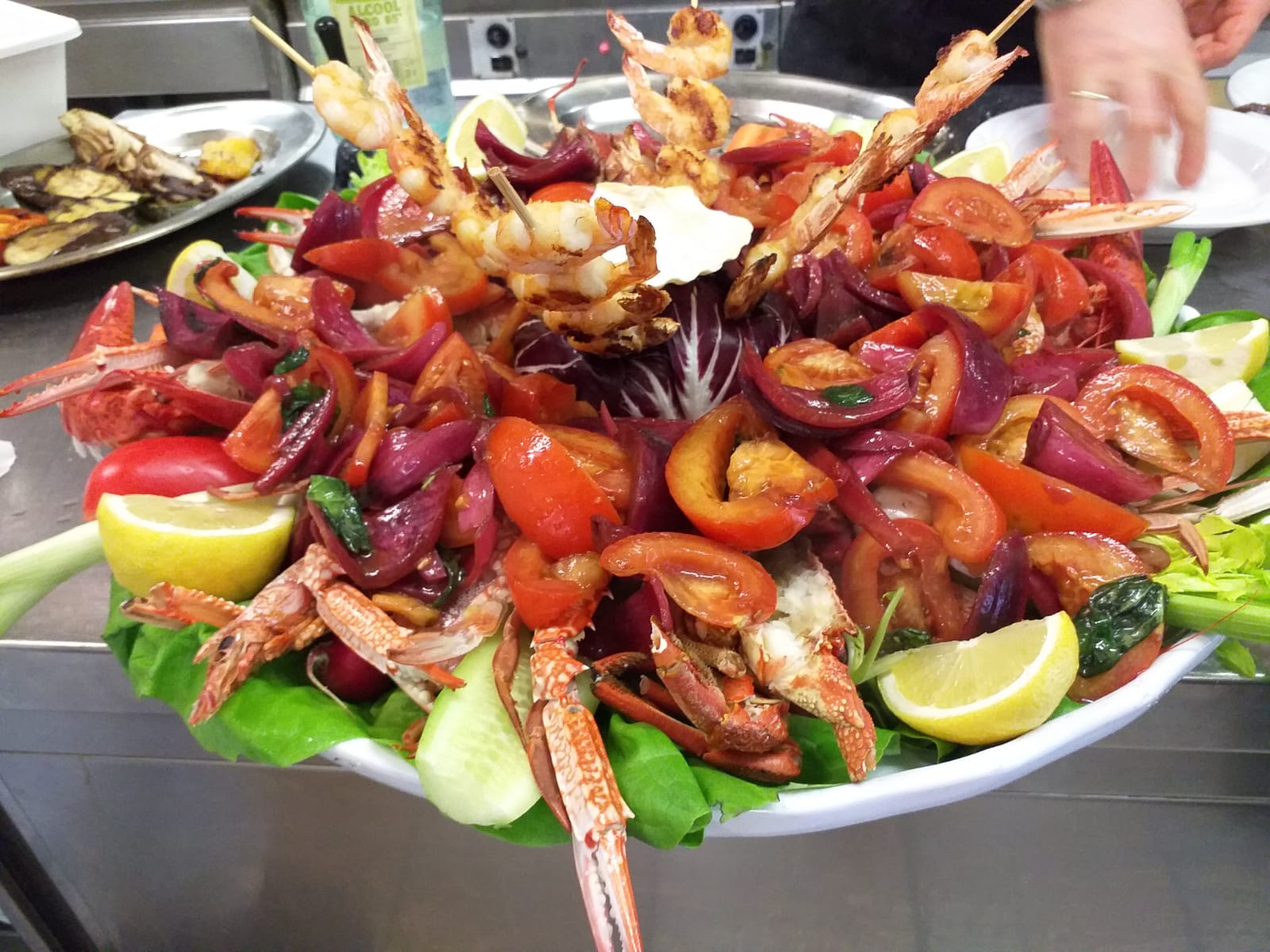 caldi alla Miami Vice, mazzancolle primavera, seppie e gamberi all'egiziana, gamberoni e bruciatini, granchi al curry, calamari a Modo Mio (patate e bacon), gamberoni in agrodolce (con mele e ananas).